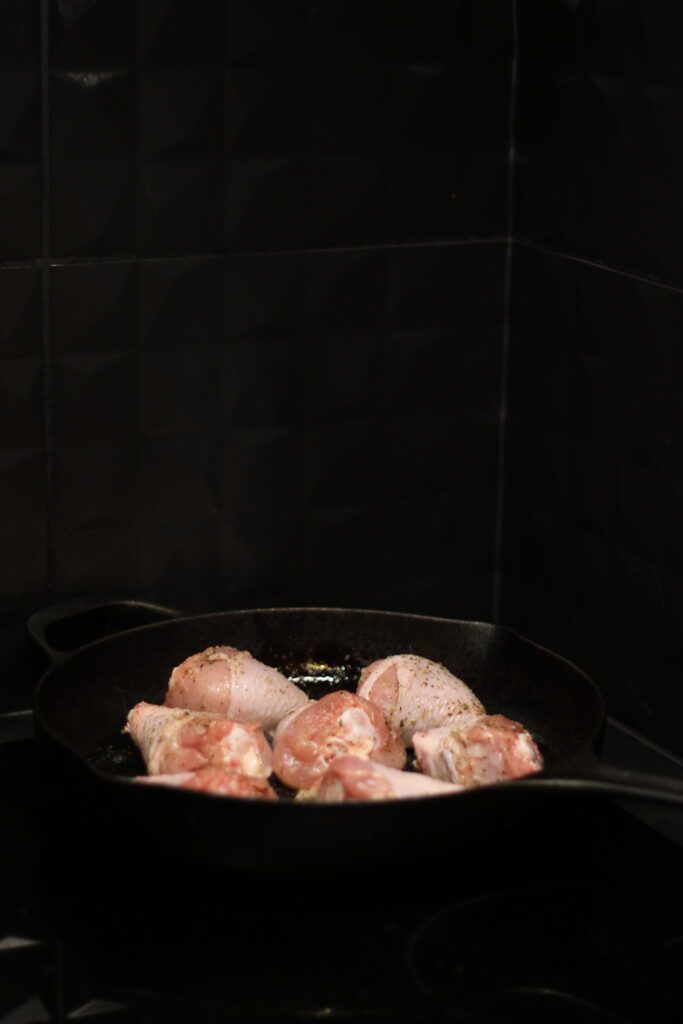 Курицу обсушите, посолите и поперчите. Разогрейте сковороду с оливковым маслом и обжарьте куски до румяной корочки с обеих сторон. Важно не торопиться — пусть цвет будет глубоким, тёплым. Переложите курицу на тарелку.