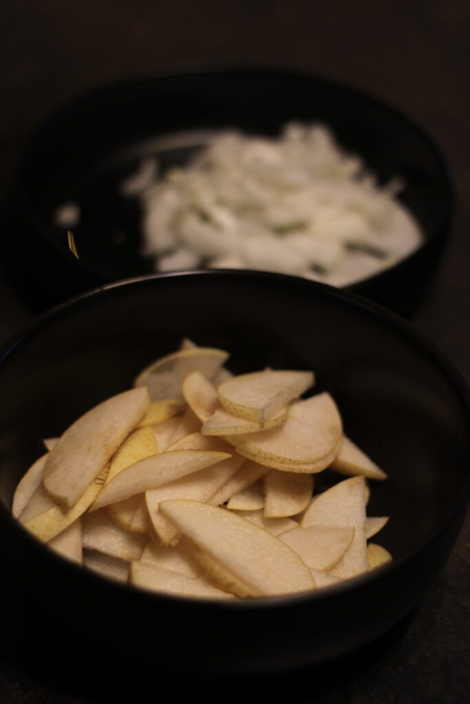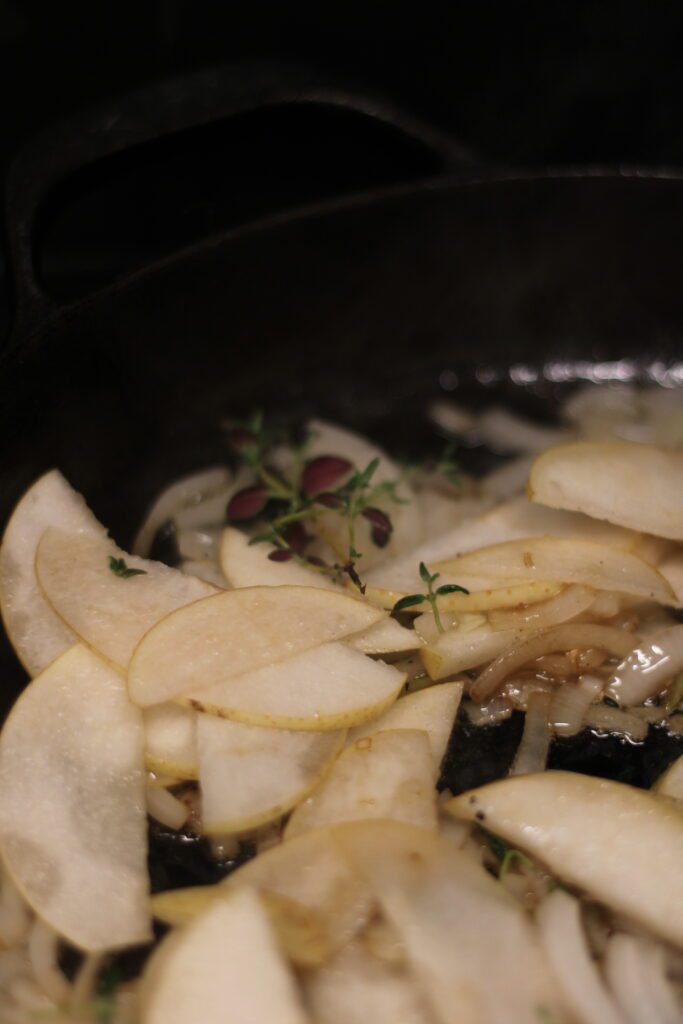 И яблоки. У меня дома на тот момент не было кислых яблок. Зеленые лучше всего. Поэтому я взяла Нэши — гибрид яблока и груши. И не прогадала. Во-первых, они плотные и хрустящие как яблоки, и пористые как груши, поэтому они прекрасно впитали соус и не потеряли форму. Во-вторых, они так подходили по цвету к этому блюду. Я не удержалась. Блюдо получилось очень теплое по краскам, нежного кремового цвета.