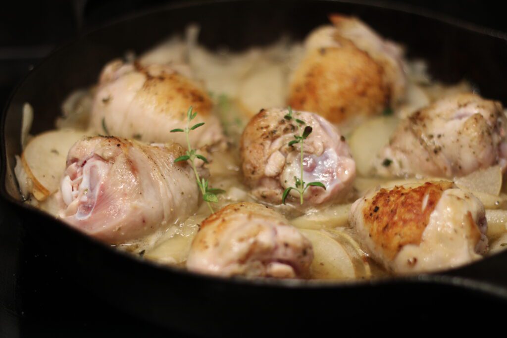 Это блюдо для серого дня, когда на улице ветер, а дома нужно что-то основательное. Согревающее. Настоящее. Яблоки, сидр, сливки, курица. Четыре ингредиента — а на выходе — шедевр.