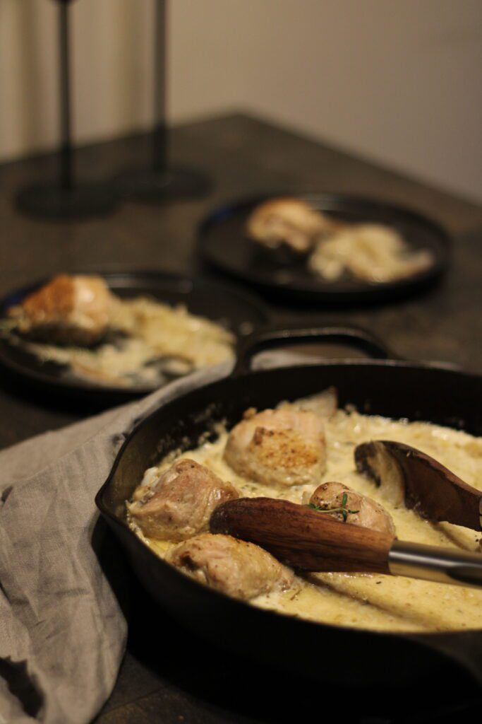 Для этого блюда я взяла свою чугунную сковородку. Возьмите любую, но такую, которая подойдет и для духовки тоже. Чтобы на ней не было никаких деревянных или пластмассовых деталей. Если такой сковороды нет, то можно обжарить на сковороде, а потом аккуратно переложить все в форму для запекания. И уже в ней подавать тогда. Или даже просто оставьте все на плите, просто сильно убавьте огонь и потомите курицу в сливках под крышкой. Соус немного загустеет.